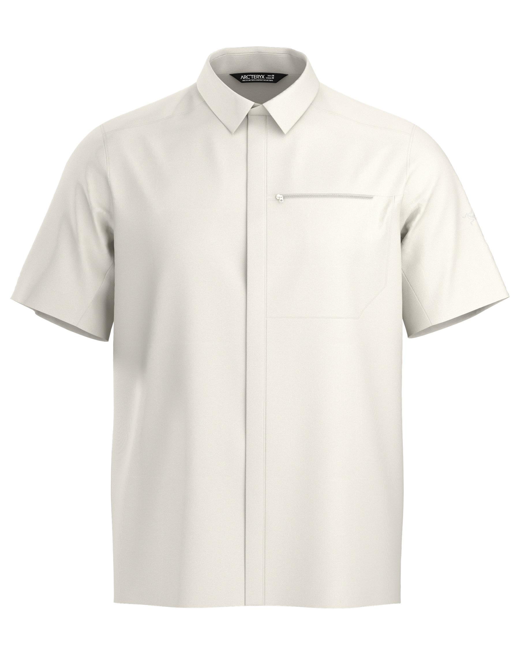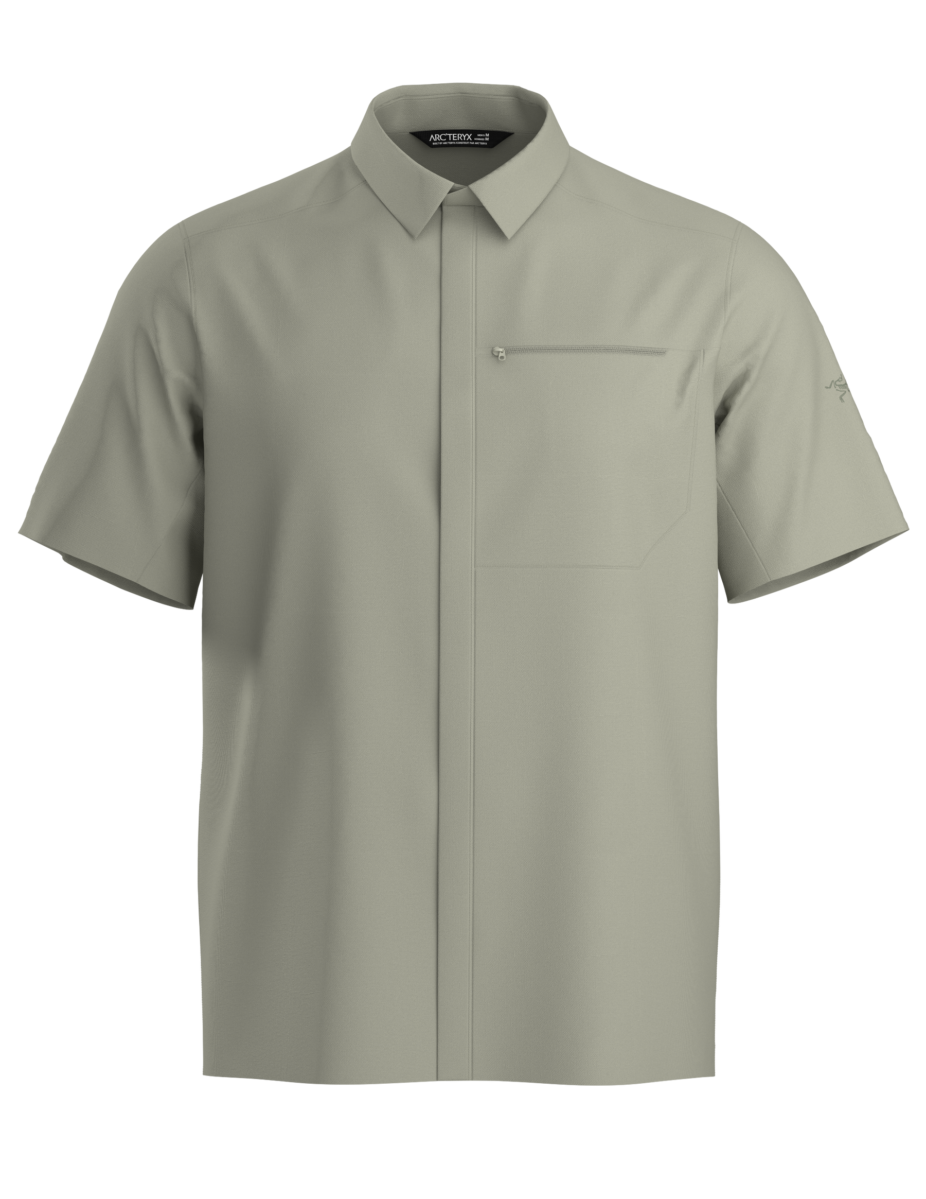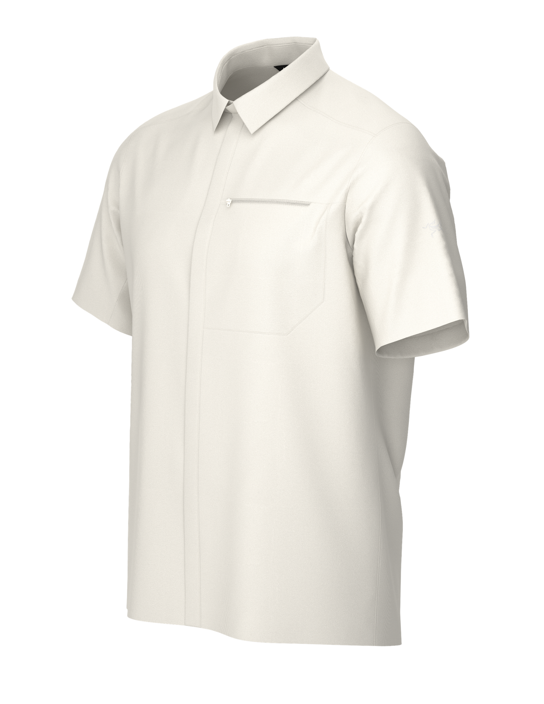 100% recycled Diem polyester fabric has comfort stretch, dries fast, resists wrinkles. Zippered chest pocket secures smartphone, passport, and wallet. Concealed snaps on placket enhance clean finished aesthetic. Articulated patterning for mobility and freedom. Provides UPF 50+ sun protection