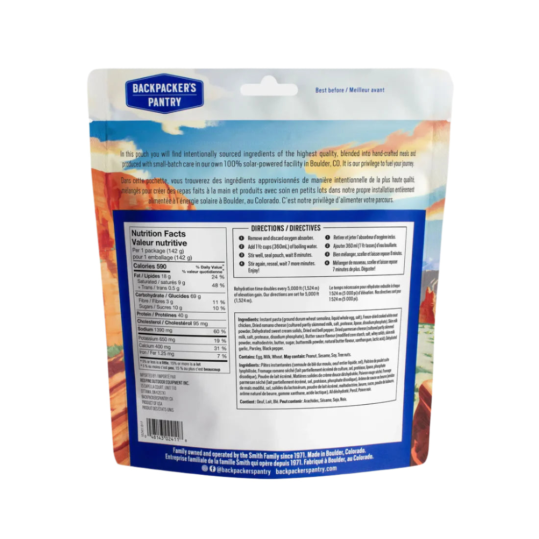 Our hearty entrée is protein-packed outdoor cuisine meticulously crafted with Belgian egg noodles made just for us, roasted red peppers, all-natural white chicken in a thick and creamy alfredo sauce. It’s a trail-ready meal for foodies.
