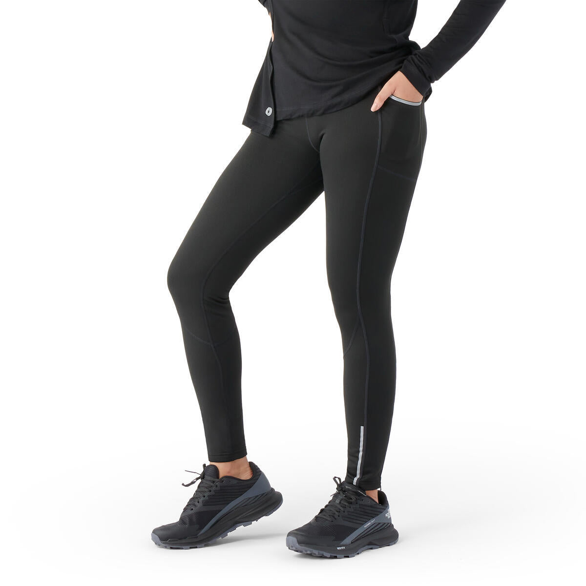 The stretchy knit fabric puts soft-brushed Merino wool next to skin while a durable synthetic material fights the elements for you. The fitted mid-rise waist and reflective elements lets you move without needing to adjust, plus ankle zips for extra breathing room.